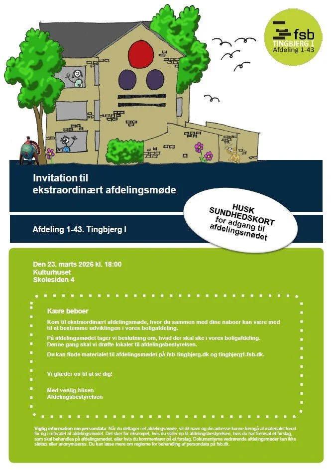 Afdelingsmøder Om afdeling 1-43 AfdelingsmøderAfdelingsbestyrelsen Bestyrelsesmedlemmer Bestyrelsesmøder Nyt fra afdelingenForretningsordenAfdelingsbestyrelsens blogBestyrelsens åbningstiderKommunikationDrift og MiljøRis, ros, ønsker og forslag Indkaldelser, materiale, budgetter og referater fra afdelingsmøder Indkaldelser og materialeIndkaldelse og materiale 21. januar 2025Indkaldelse og materiale 11. september 2025Indkaldelse og forslag 23. marts 2026 BudgetterBudget 2025Budget 2026 ReferaterReferat fra ordinært afdelingsmøde 21. januar 2025Referat fra ordinært afdelingsmøde 11. september 2025 Næste ordinære afdelingsmøde afholdes 17. september 2026 Forslag til afdelingsmødet i afd. 1-43 (pdf)Forslag til afdelingsmødet i afd. 1-43 (word) Stil forslag