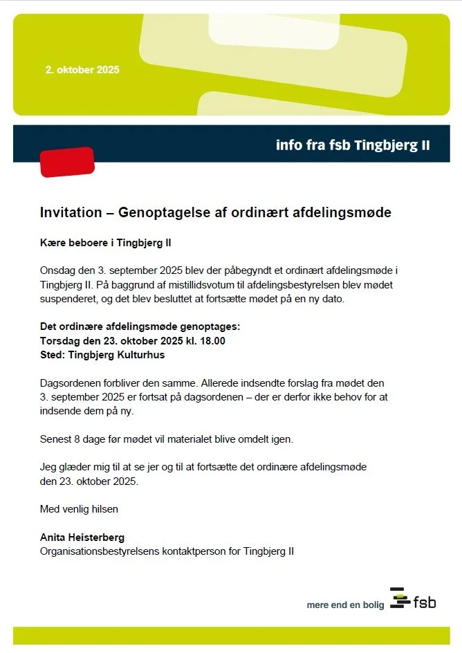 Jeg vil minde om, at fsb løbende opdaterer omkring forløbet i sagen, informerer om nye tiltag osv. på deres hjemmeside. Her finder du et link: https://tingbjerg2.fsb.dk/nyheder/