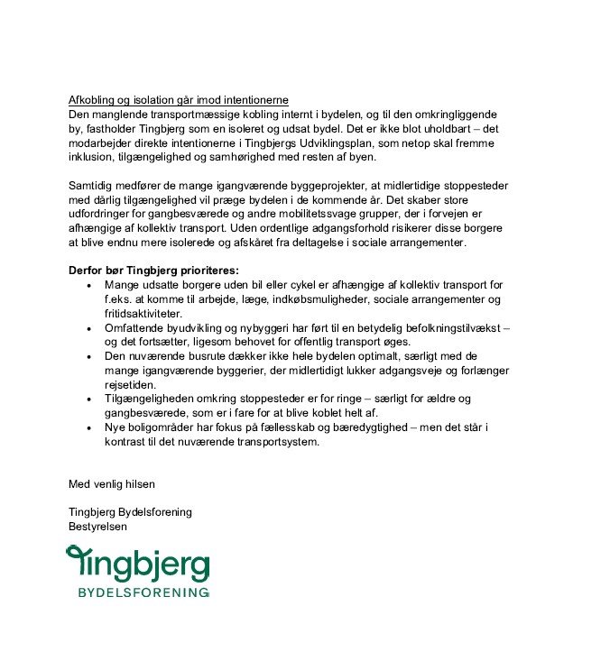 For at varetage de fælles interesser for alle beboere, besøgende og erhvervsdrivende i Tingbjerg har Bydelsforeningen ønsket at bidrage til at sætte politisk fokus på de udfordringer, som den mangelfulde offentlige transport i området medfører. Spidskandidaterne fra de forskellige partier, der opstiller til kommunalvalget i København, har modtaget en skrivelse med en opfordring til handling for at forbedre forholdene for Tingbjergs borgere. Politikerne er blevet opfordret til at inddrage Tingbjergs trafikale situation i deres politiske arbejde og gøre den til et punkt i den kommende valgkamp.